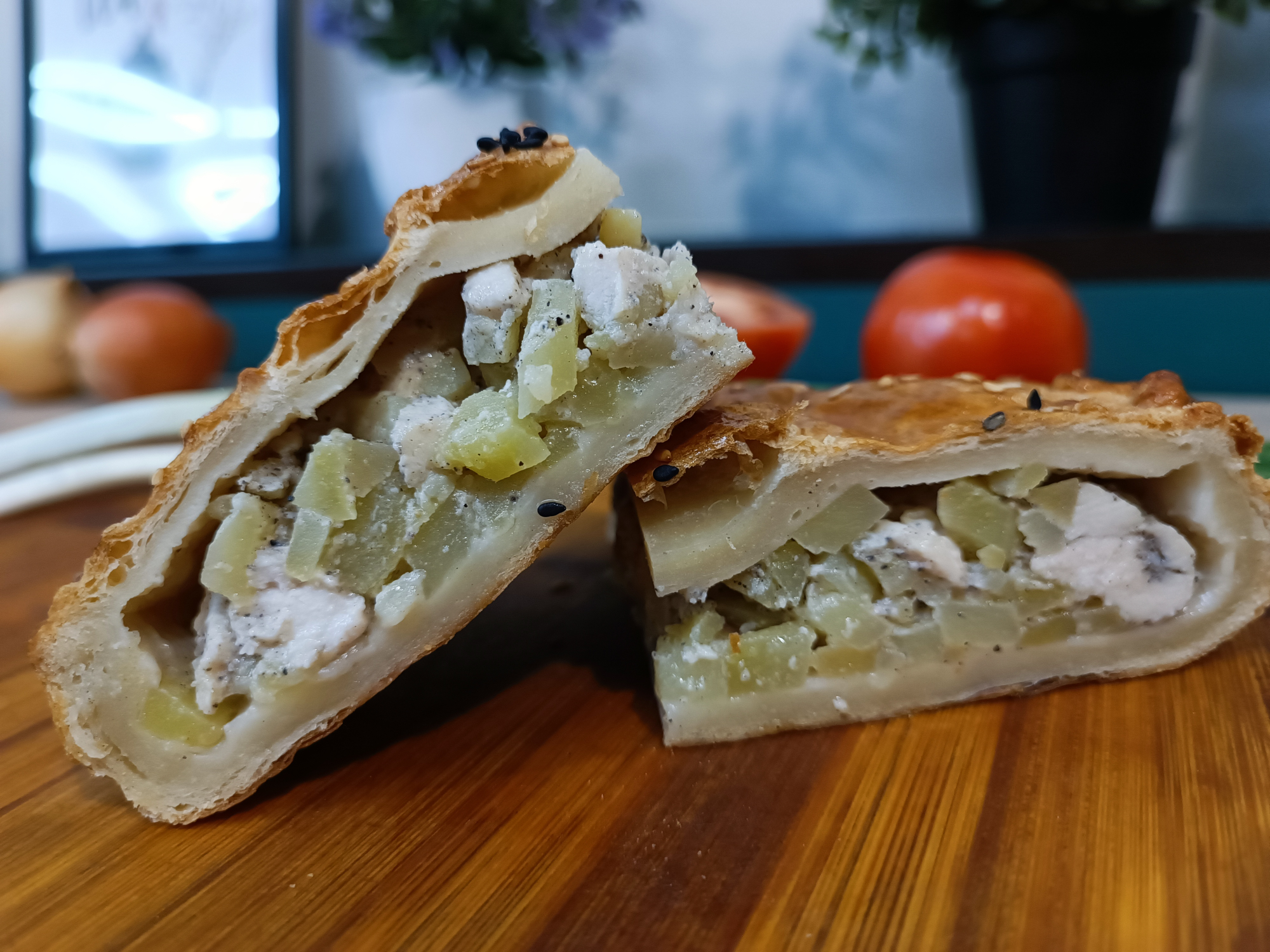 Состав: Тесто слоеное, филе куриное, шампиньоны, лук репчатый.